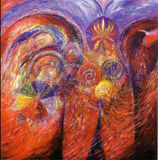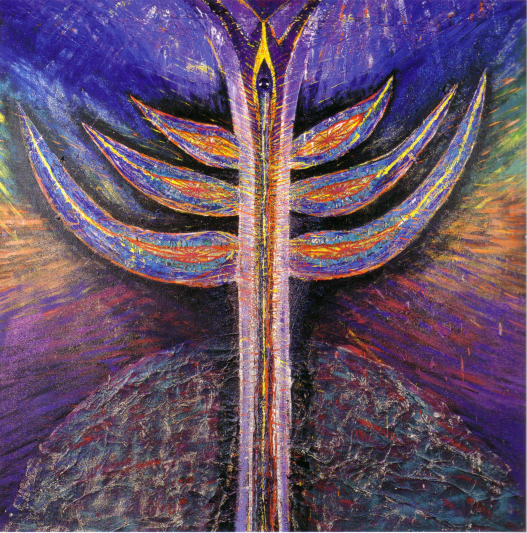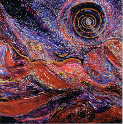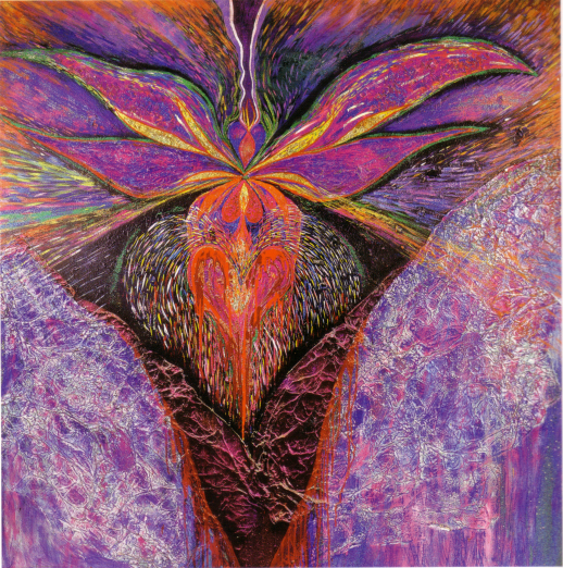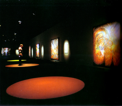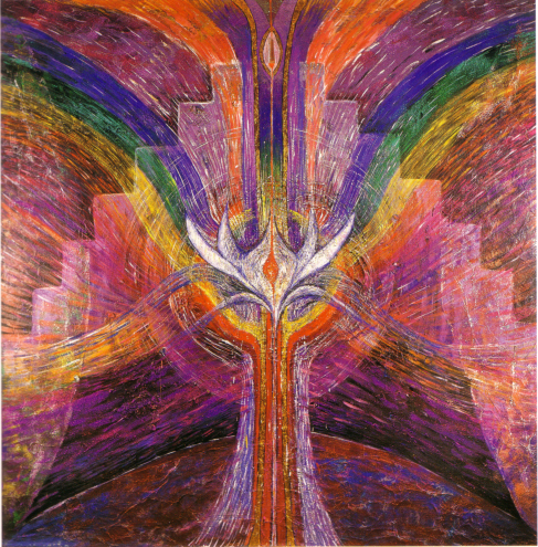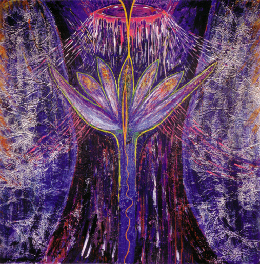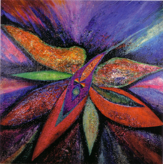 A trip to the Rothko Chapel in Houston inspired Beth Ames Swartz to create her series A Moving Point of Balance. "The feeling of wanting to create a contemplative atmosphere or environment came to me during that visit. I conceived my next major series, A Moving Point of Balance, as a contemplative environement." Swartz described the work: "Concepts related to spirituality, shamanism, and healing were woven together to create a complex installation consisting of paintings, light projections, music, and a medicine wheel. The installation's principal paintings depict the seven chakras, which are points located along the spine through which universal energy flows into the body. In this work, each multilayered canvas fulfills a specific function and purpose. Viewers were encouraged to particpate and interact with the installation." The work was first exhibited at the Nickle Arts Museum, Univeristy of Calgary, Alberta, in 1985 and appeared in nine U.S. venues over the next five years.