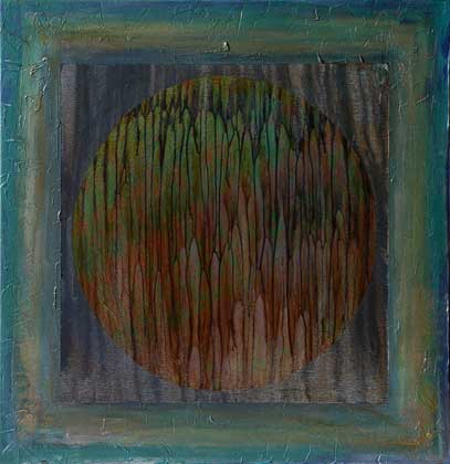 Beth Ames Swartz An image of mysterious wisdom won by toil acrylic, paste and holographic film on canvas 30" x 30" (0.76m x 0.76m) 2005
